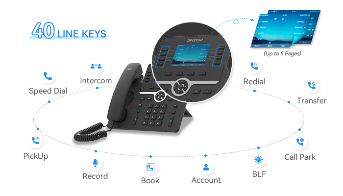 Featuring 40 Line Keys, 4 Soft Keys, and 6 Function Keys, all fully programmable, C64G/C64GP IP Phone provides one-touch access to frequently used features like speed dialing, call transfer, and conference calling, boosting productivity by enabling users to customize functions, ensuring efficient and personalized usage.